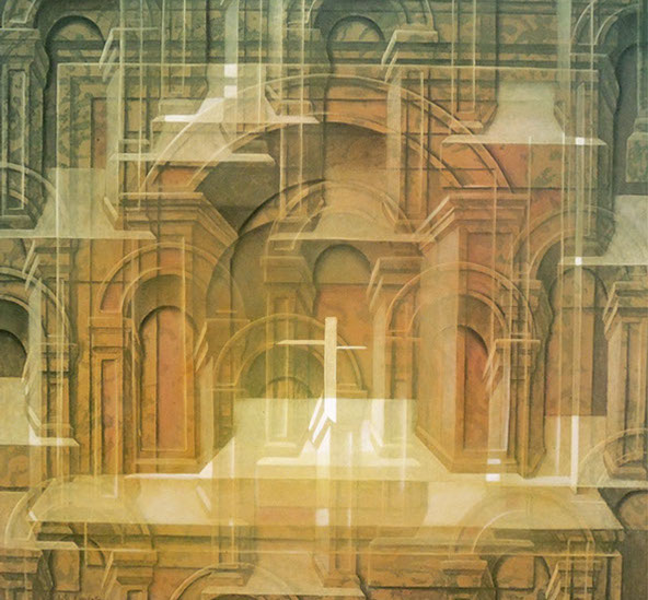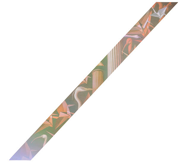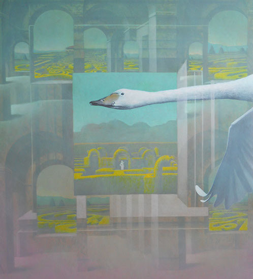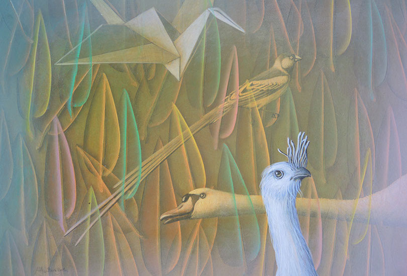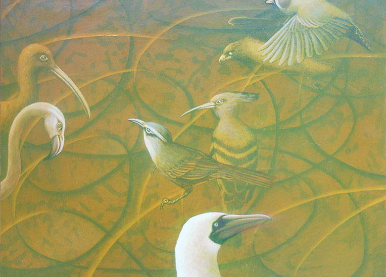 Así llegamos al relato de SIMURG, el rey de los pájaros, que un día desaparece y se inicia su búsqueda por parte de los demás pájaros cuando se dan cuenta de que lo necesitan para su salvación. Narra el pintor cómo quiso plasmar ese tránsito a través de siete valles circulares del esfuerzo y de cómo algunos quedan atrapados en el camino por otros intereses: el jilguero se enamora de la rosa y abandona la búsqueda, la perdiz busca piedras preciosas y también abandona…, solo unos pocos logran llegar al destino para descubrirse en la búsqueda a ellos mismos y así dar un giro y convertirse en alguien distinto que ya no necesita al rey para salvarse.