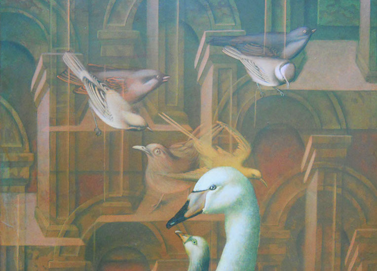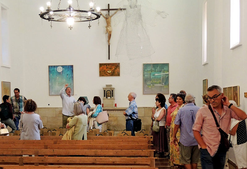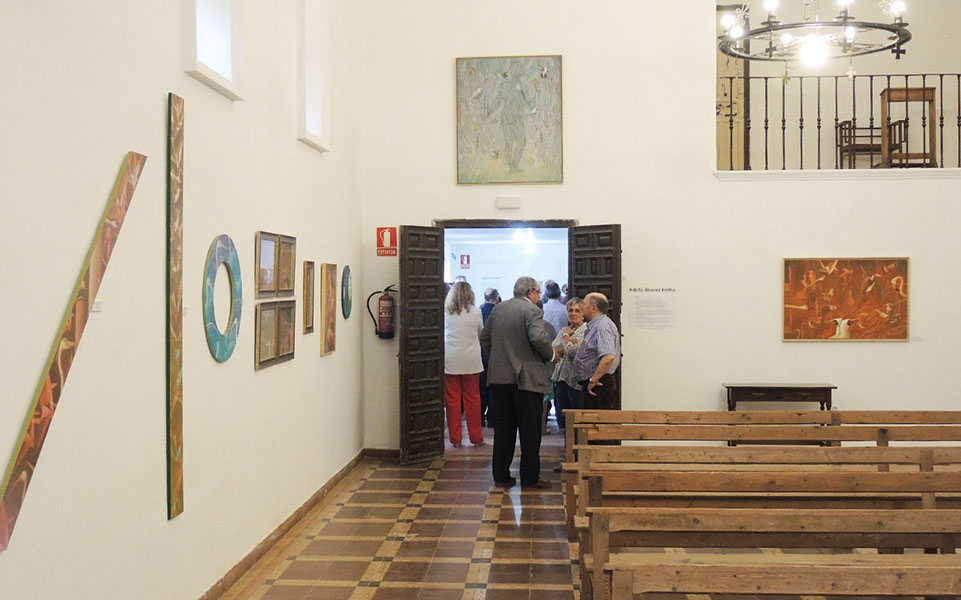 El objeto de nuestra visita fue conocer la exposición SIMURG del pintor leonés Adolfo Álvarez Barthe. Él mismo nos guía y nos habla de lo que quiso transmitir en sus pinturas. Los cuadros, expuestos en lo que fue la antigua capilla de la finca, permiten una observación amplia y cercana. Están pintados al temple, sobre madera o papel, lo que según su autor permite el añadido de sucesivas capas que facilita expresar infinidad de matices que con otra técnica pictórica no sería posible. Los pájaros, minuciosamente pintados sobre los fondos alegóricos, nos presentan unos picos, cuellos y cabezas en distintas posiciones y giros que semejan símbolos que quisieran decirnos algo. En algunos cuadros aparecen pintados pájaros hechos en papiroflexia, que hacen referencia al guión de un relato escrito en el siglo XII por el poeta sirio Farid ud-Din Attar, el coloquio de los pájaros, que hace de hilo conductor de la exposición.