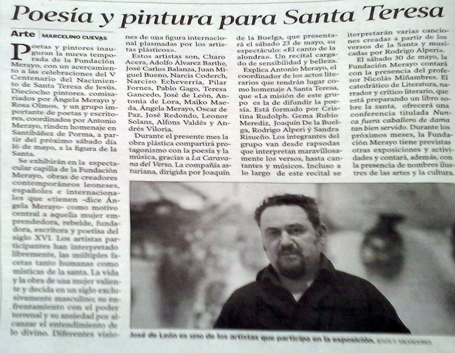 También es teresiano el escenario es esta institución. El patio de la Fundación Merayo y la arcilla utilizada por Charo Acera hubieran hecho las delicias de Teresa de Ávila. No hay que olvidar que en todas sus fundaciones y en sus crisis más grandes, la Santa siempre se vio acompañada de una imagen.