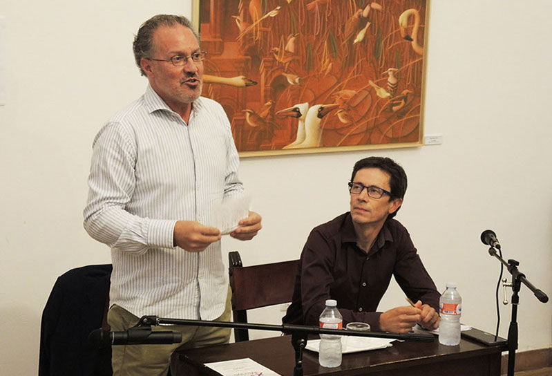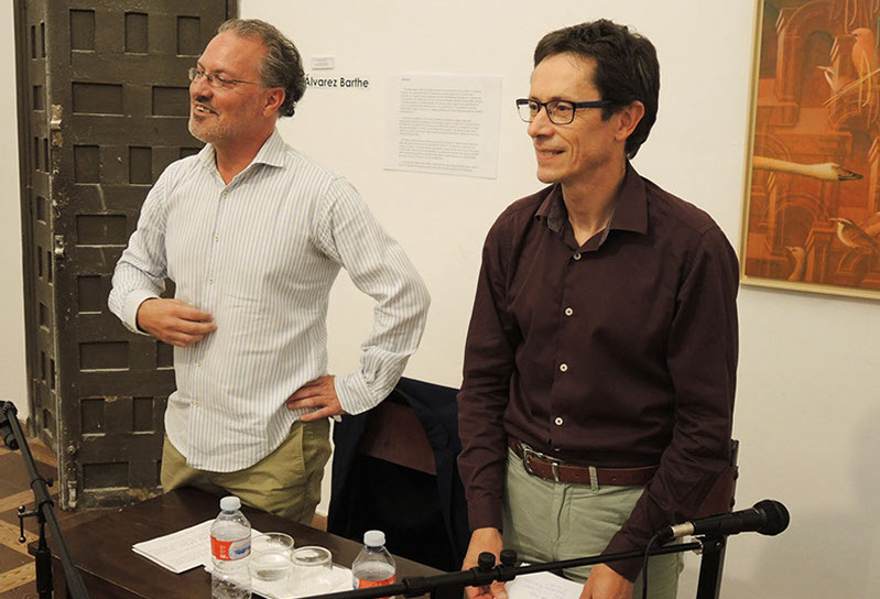 Con motivo de la exposición de Adolfo Álvarez Barthe en la Fundación Merayo, el autor y Vittorio Baglione sostendrán un diálogo que abundará sobre el tema que la muestra ilustra: Simurg, rey de los pájaros. Tan importantes como las migraciones de las aves son las de los relatos. Y, para la literatura, las migraciones de los relatos de aves han producido los frutos más exquisitos. A menudo esa rica literatura ha sido ilustrada por imagineros y pintores de distintas épocas y estilos muy diversos. Se han realizado también innumerables dibujos y siluetas de pájaros con letras árabes. Alfombras, telas y tapices han reproducido el vuelo y la quietud de tan inquietos animales. Los naturalistas y los científicos nos han legado fieles retratos de las aves y mapas poblados por líneas abstractas que nos informan de sus migraciones.