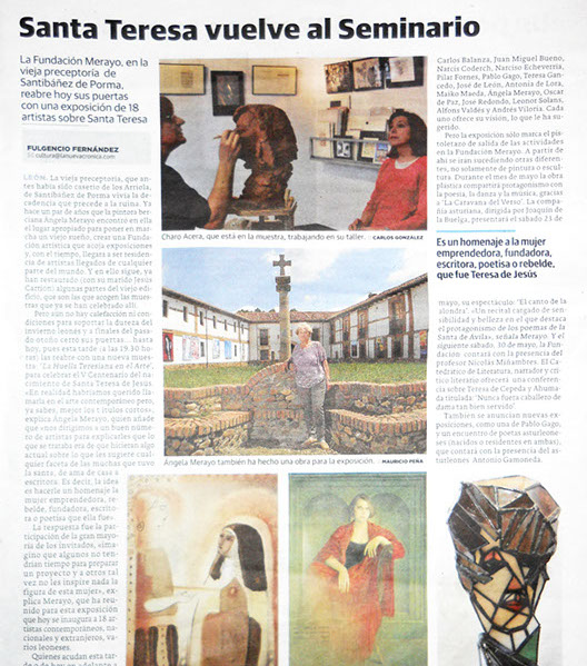 La Fundación Merayo de Santibáñez del Porma (León) inaugura este sábado 16 de mayo su nueva temporada, la segunda, con la exposición “La huella teresiana en el arte”. Una muestra colectiva en la que participan 18 artistas y que se suma a la celebración del V Centenario del nacimiento de Teresa de Jesús. Permanecerá hasta el 18 de octubre.
